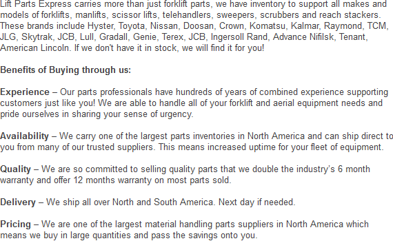We have great prices on all our lift truck parts. Phone today to get an estimate on one of the attachments or parts we offer. We can be reached at:
